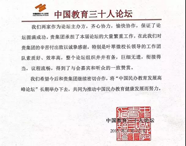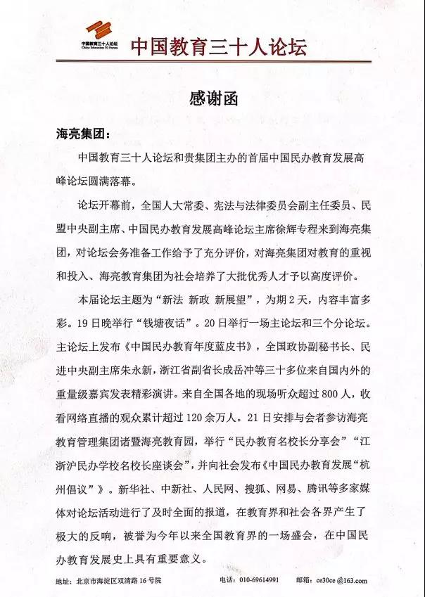4月22日,海亮集團收到了一封來自中國教育三十人論壇的感謝函,中國教育三十人論壇對海亮集團成功主辦首屆中國民辦教育高峰論壇,并為此所做的大量切實高效的籌備工作和會務工作予以了高度肯定。感謝函這樣寫道:我們兩家作為論壇主辦方,齊心協(xié)力,愉快協(xié)作,保證了論壇圓滿成功。貴集團承擔了本屆論壇的大量繁重工作,在此我們對貴集團的辛苦付出致以誠摯感謝。特別是葉翠微校長領導的工作團隊素質(zhì)好、效率高,整個論壇組織井井有條,巨細無遺,銜接得當,議程流暢,得到了與會嘉賓和聽眾的一致贊賞。